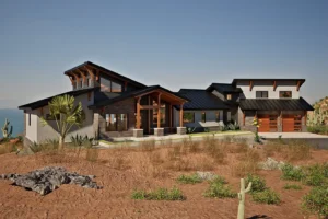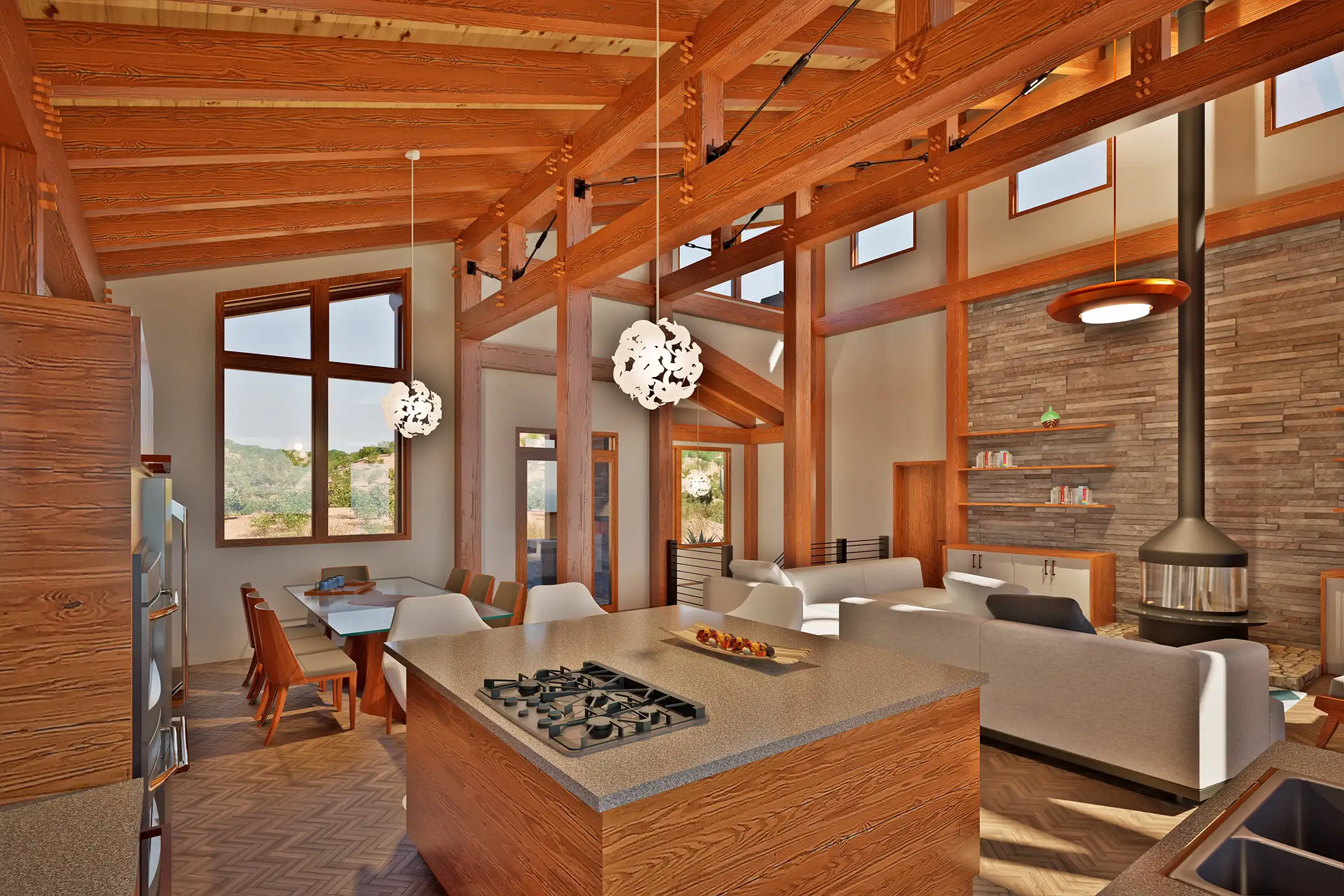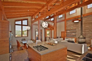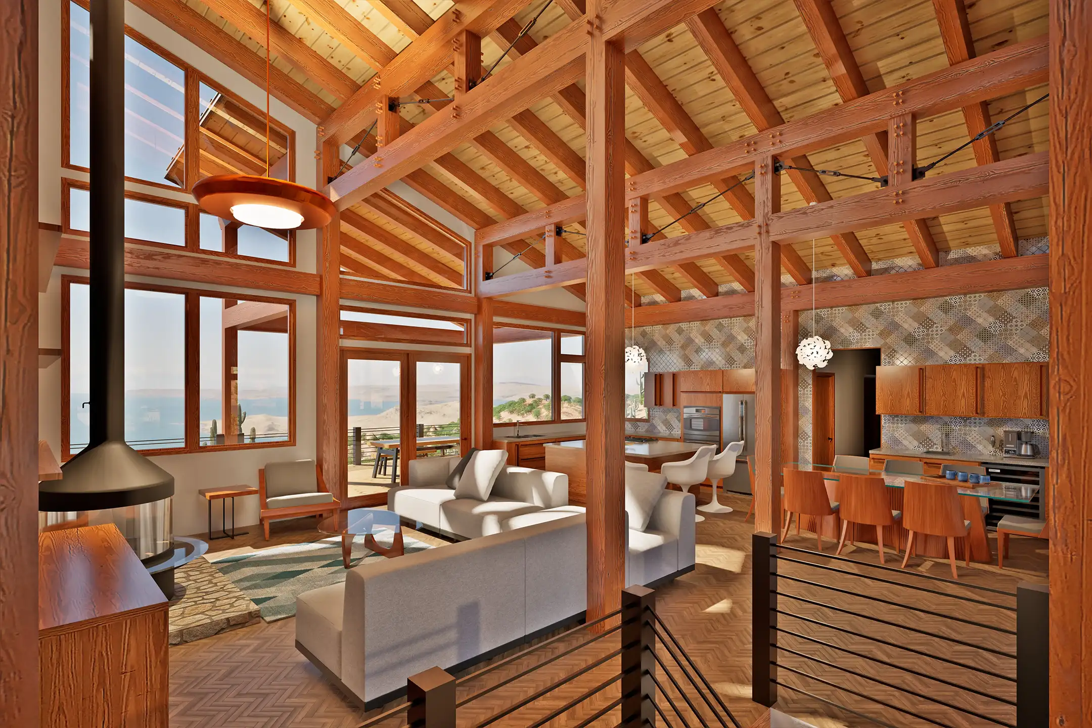 Designed with lifestyle in mind, the Scandinavian-inspired fireplace serves as a focal point, replacing traditional hearths and enhancing the open living area while allowing light to filter through clerestory windows. The strategically positioned bedroom areas take full advantage of the surrounding vistas, ensuring serene escapes with every glance.