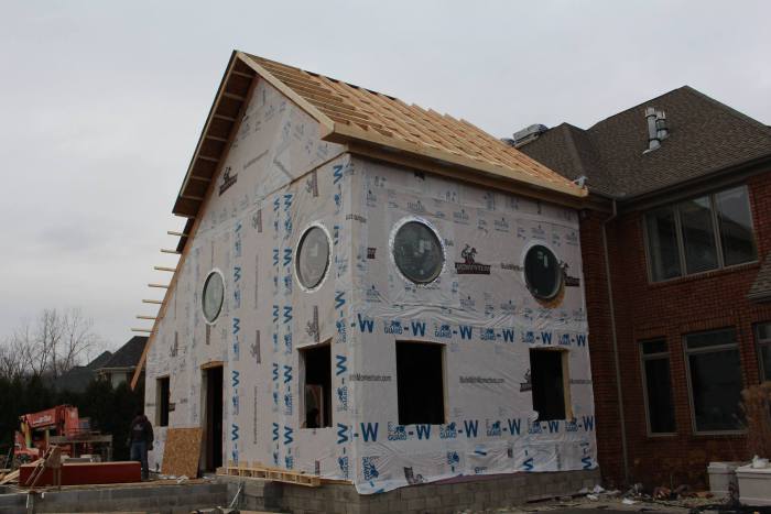 More progress on the timber frame addition going up in Monroe, MI. This addition will be an entertaining space adjacent to the existing living room, with a small kitchenette in the corner.
