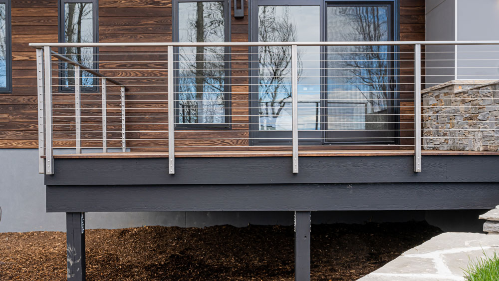 Another critical element for many decks is railings, for both safety and style. As you’ve seen in this post, not all deck spaces will call for them — like the ground-level deck seen in the StreamRock plan earlier. However, most building codes require railings when a deck surface is 30 inches above grade or more. Of course, local codes will vary, so this is something your design team will help you navigate. Common railing materials include wood or composite to echo the warmth of the timbers, metal for a customizable look, or glass and cable systems for a more contemporary feel.