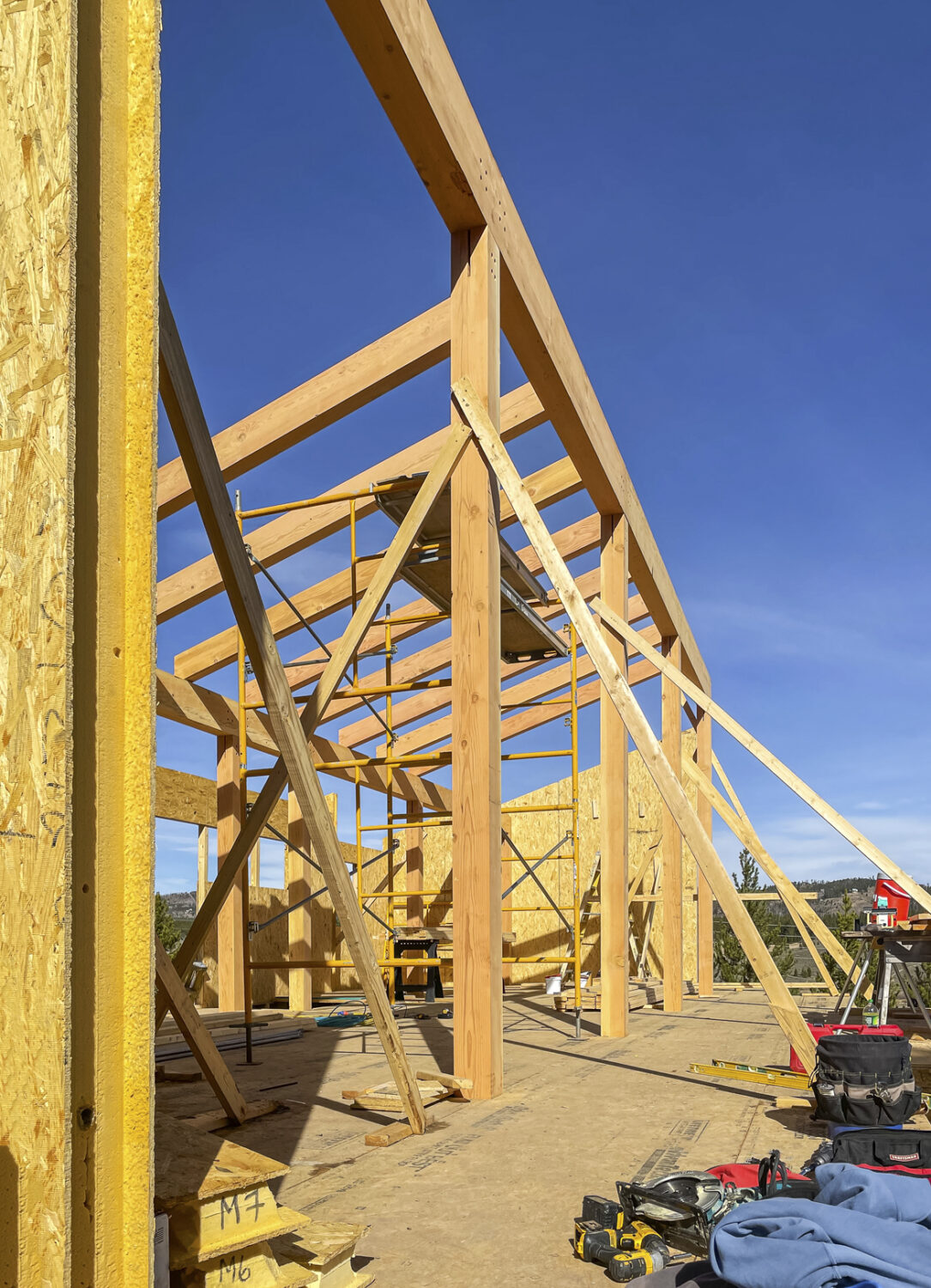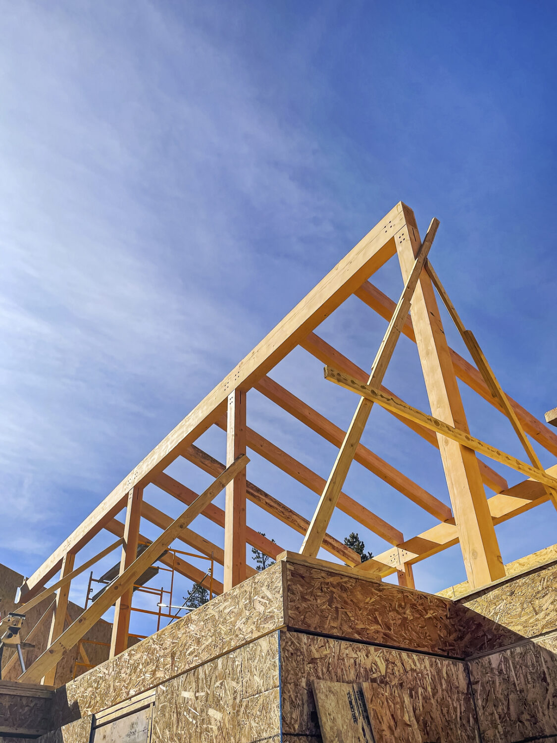 Take a peek at the Woodhouse timber frame building process in this latest gallery: you can see that the timber frame has finished being assembled, so within weeks the SIP panels, roofing, doors, and windows, will all be installed in time to weather-proof the structure before winter sets in. Construction can then continue inside the shell while the worst of winter passes outside, ensuring the quickest possible delivery of the finished home.