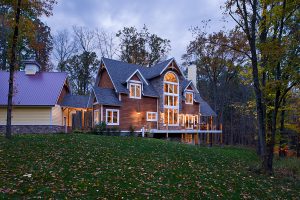 Exterior, horizontal, front 3/4 view showing covered deck at twilight, Pat & Tracy Seaman residence, Trumansburg, New York; Woodhouse