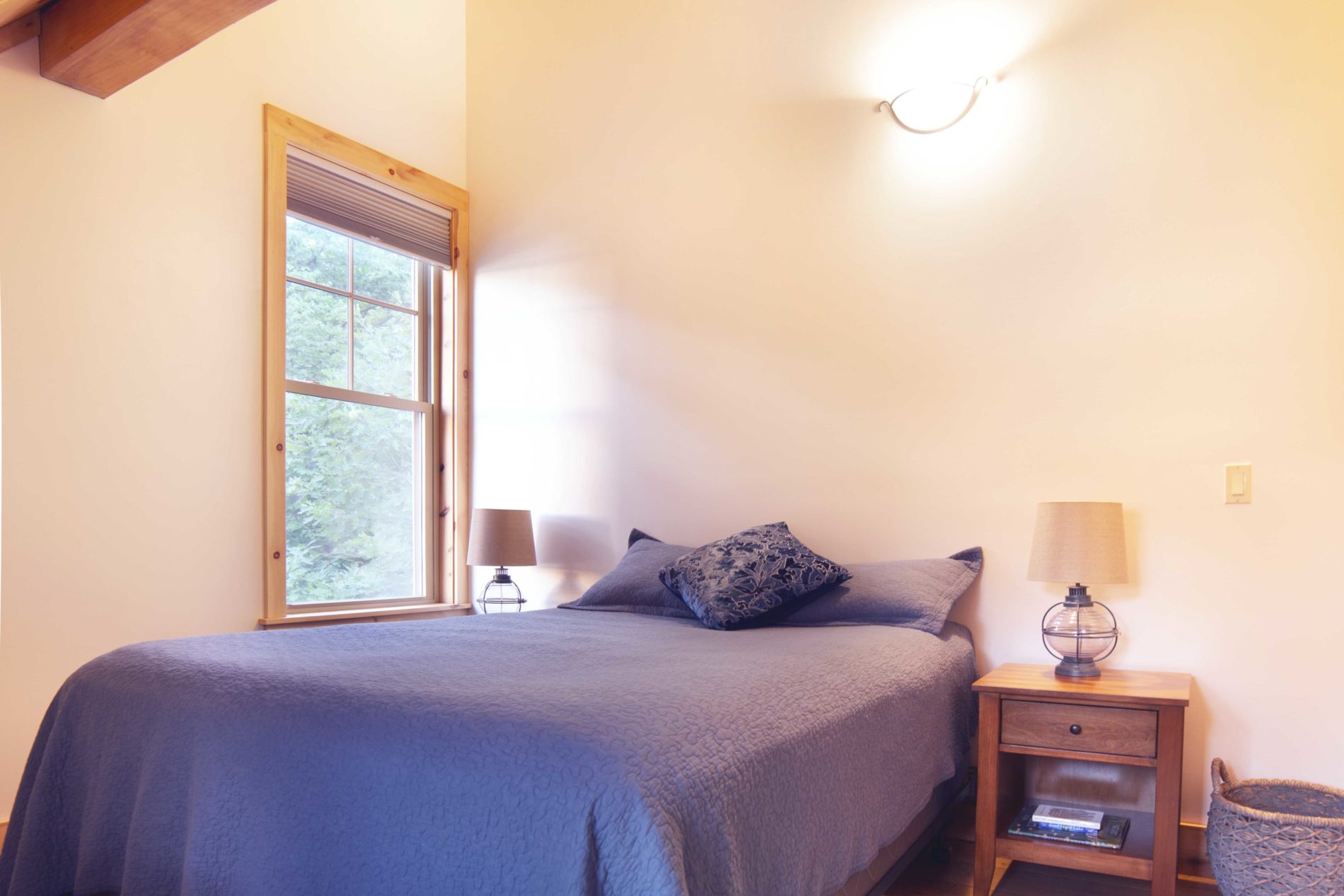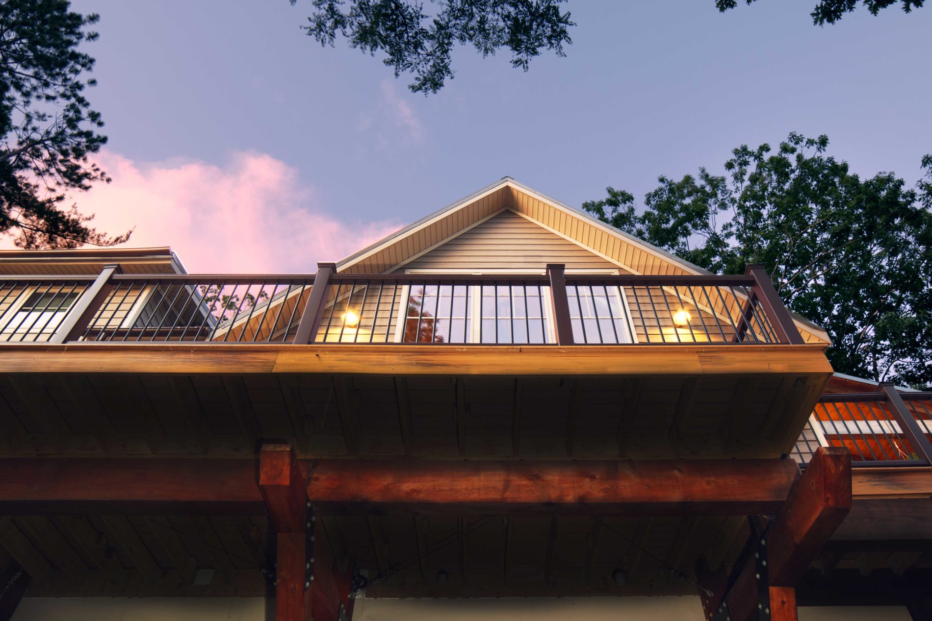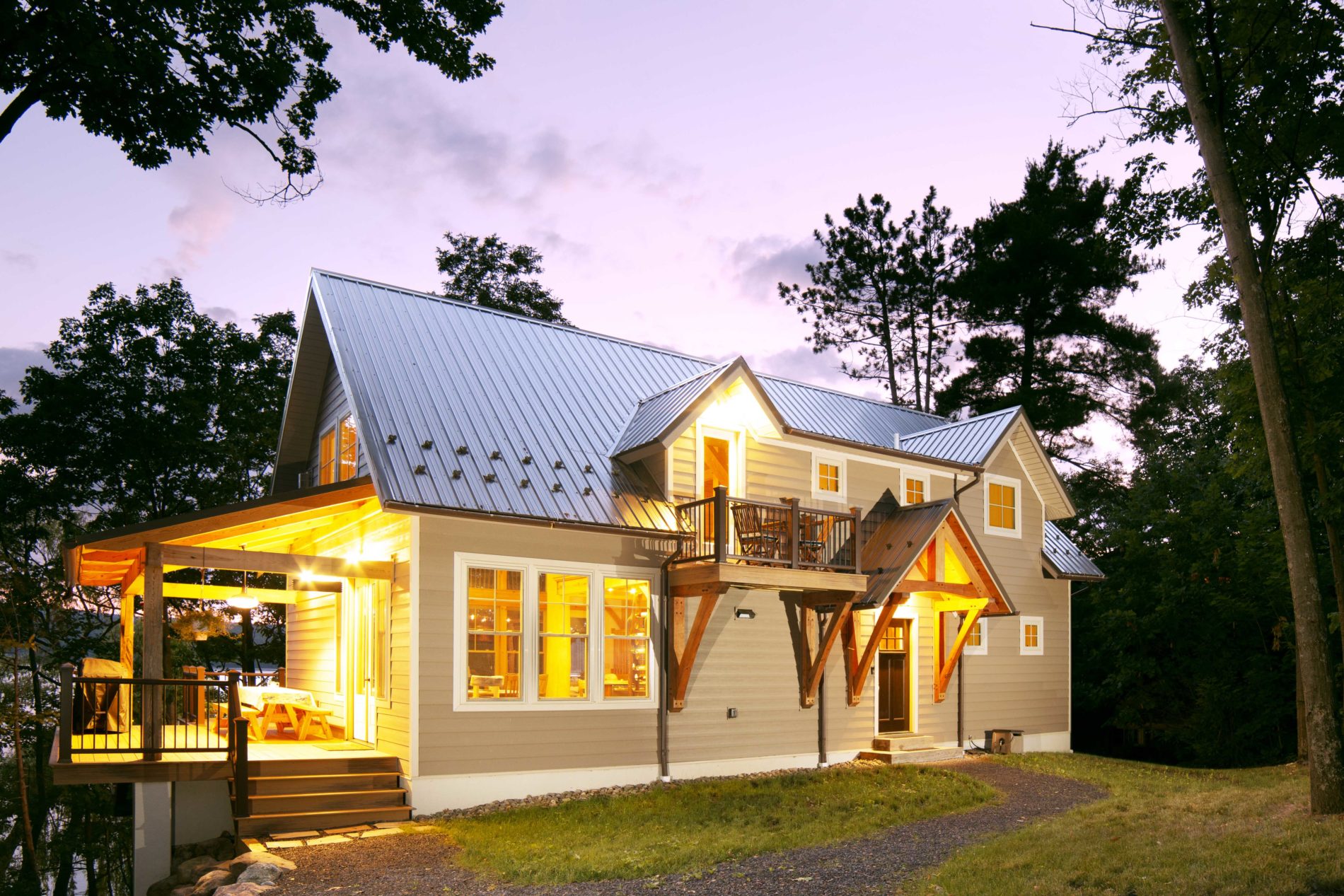 This custom lake home enjoys stunning views of Seneca Lake from its wrap-around porch and expansive windows located throughout the house. The kitchen, living room, and dining area all enjoy an open plan arrangement, viewable from the Mezzanine upstairs. It features multiple bedrooms and bathrooms to easily accommodate family gatherings. It was designed by designer Raymond Lefebvre in collaboration with Woodhouse.