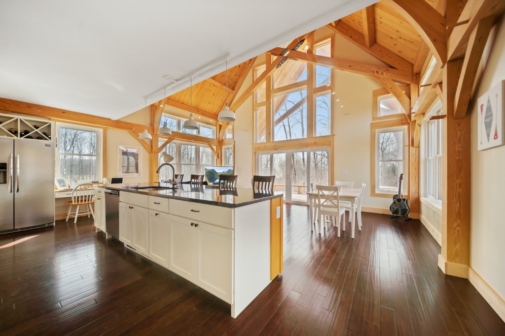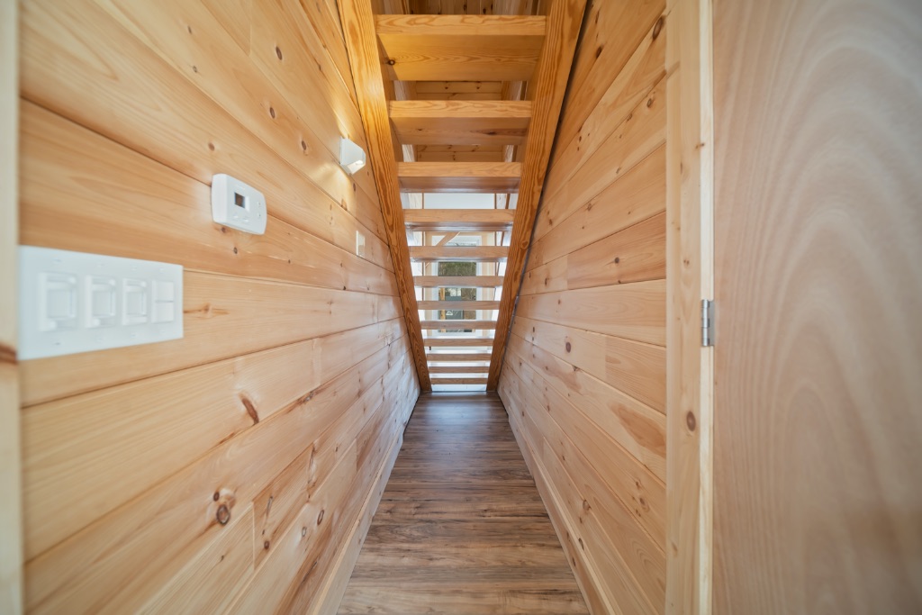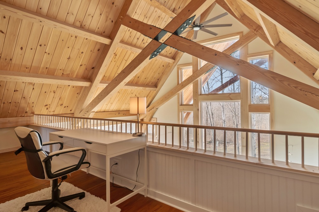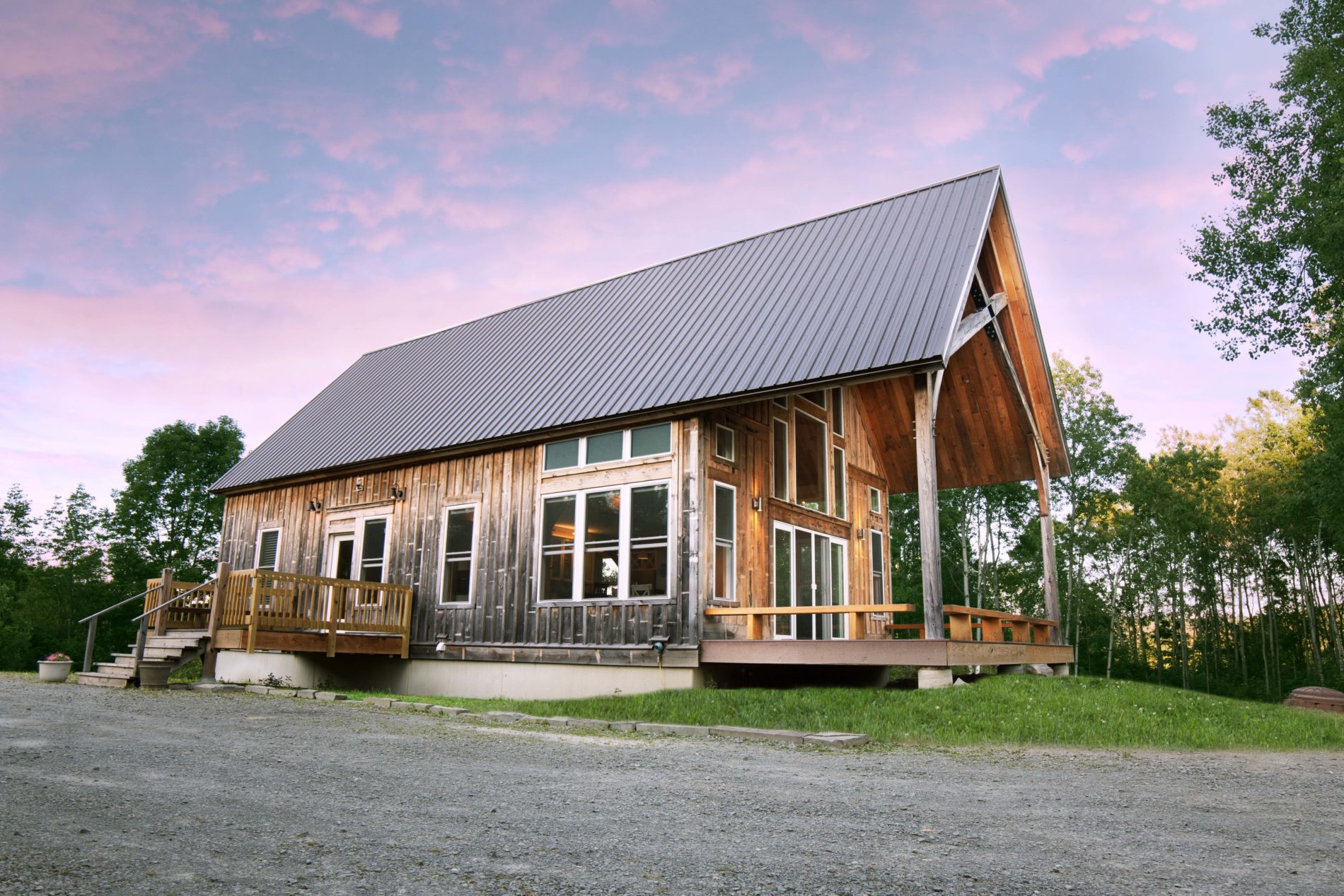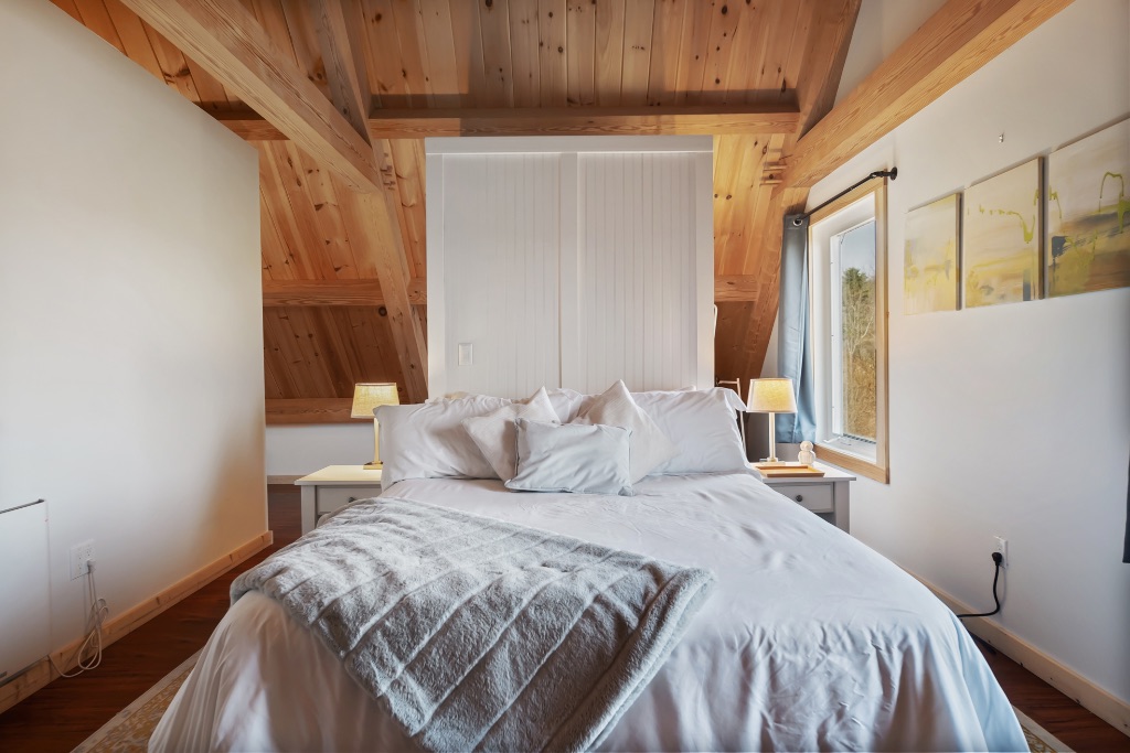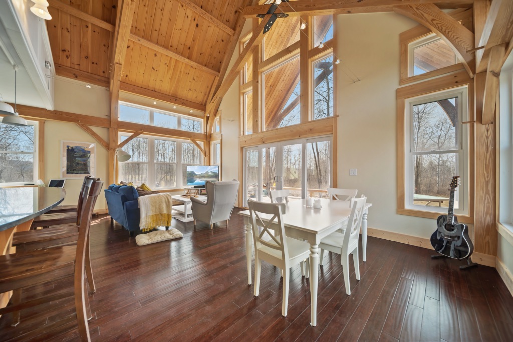 This charming 2400sq ft Southern Yellow Pine cottage is nestled in the forest near Freeville, NY. It boasts a large open living room and kitchen with sliding doors that lead to the front porch. The main floor also has 2 bedrooms, 1 bathroom, and a laundry room. The upper floor features the master bedroom and bathroom, with a slanted roof and exposed timbers that create a cozy atmosphere. It was designed by the Woodhouse design team lead by Raymond Lefebvre when he was the Director of Design at Woodhouse.