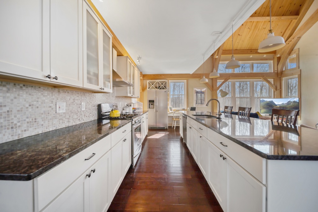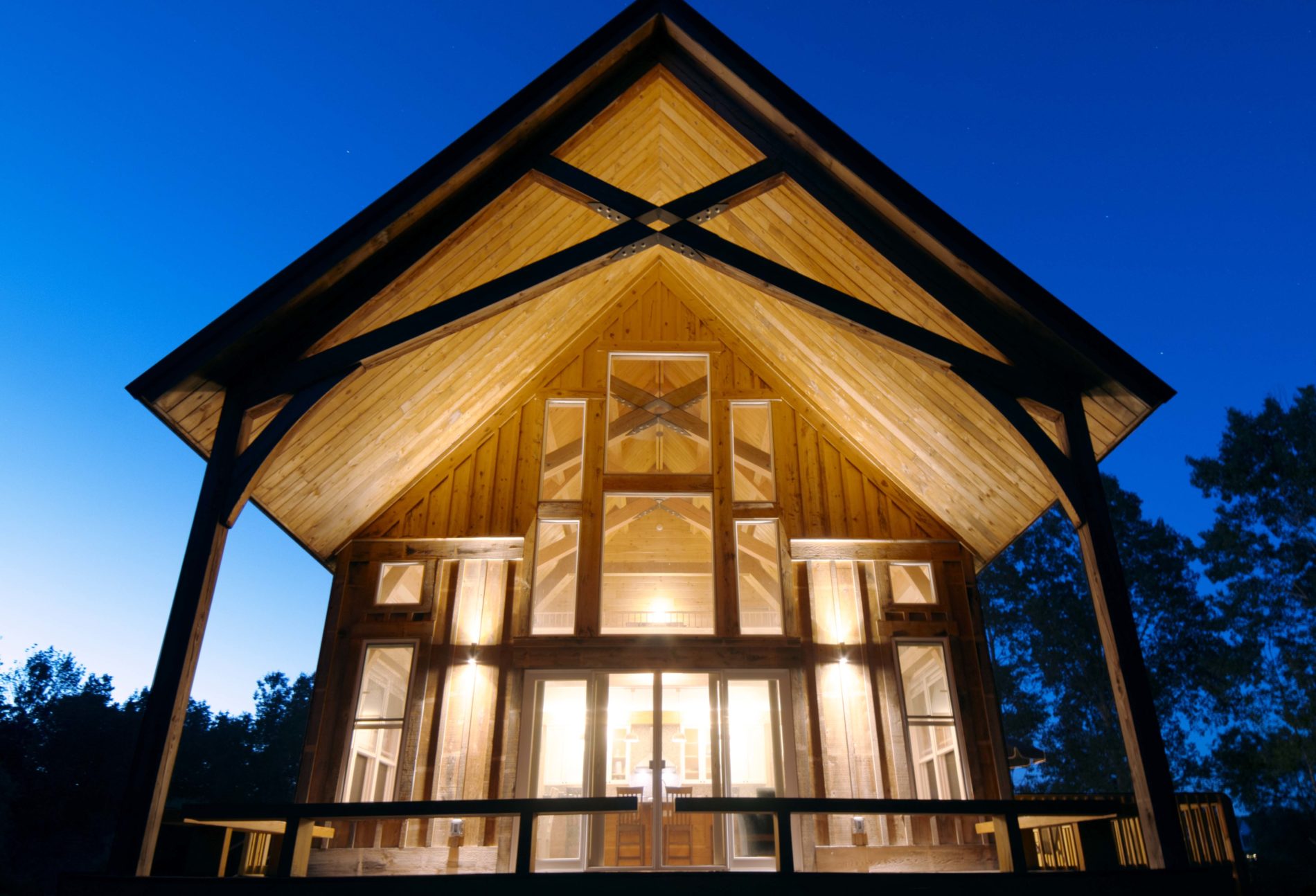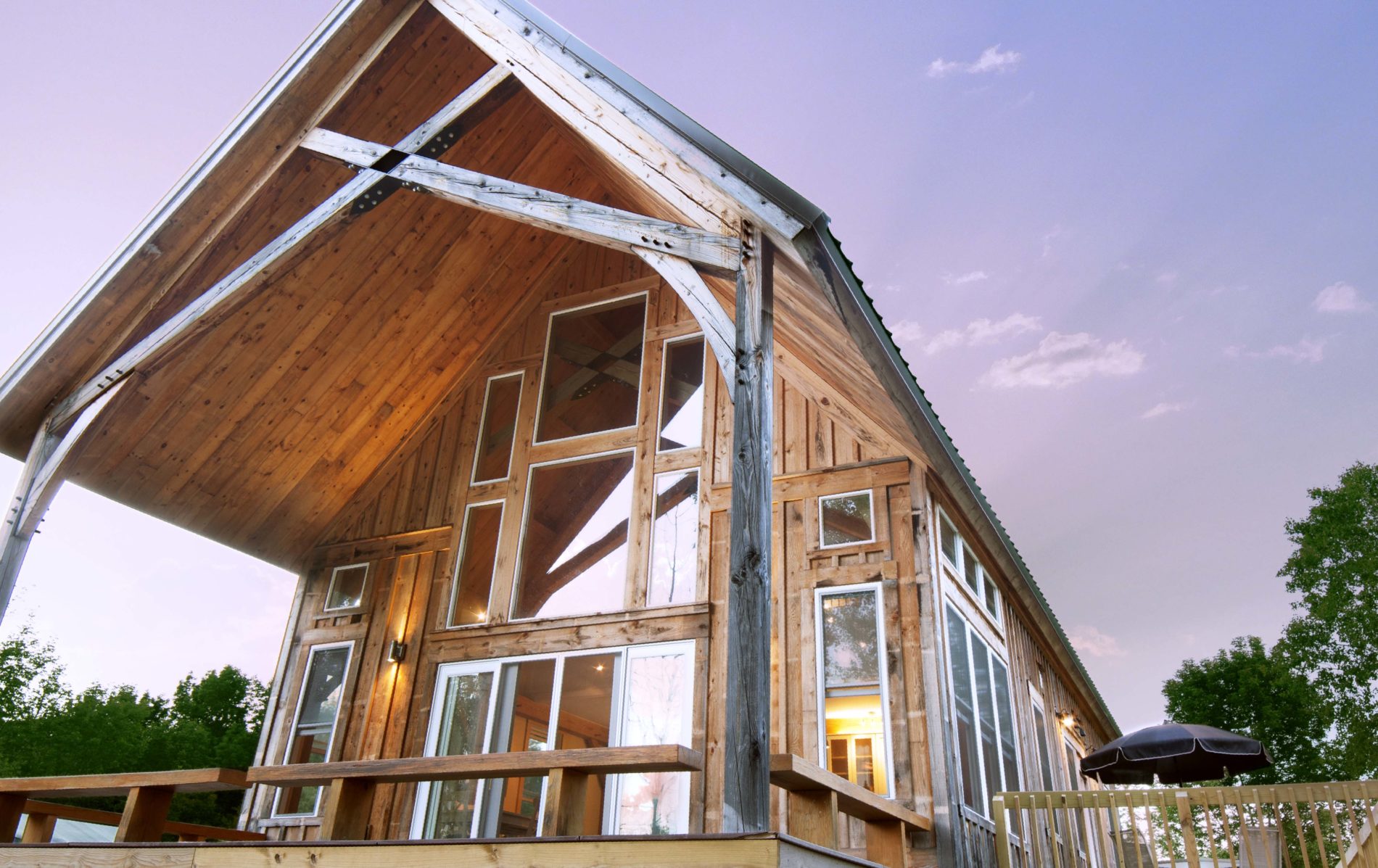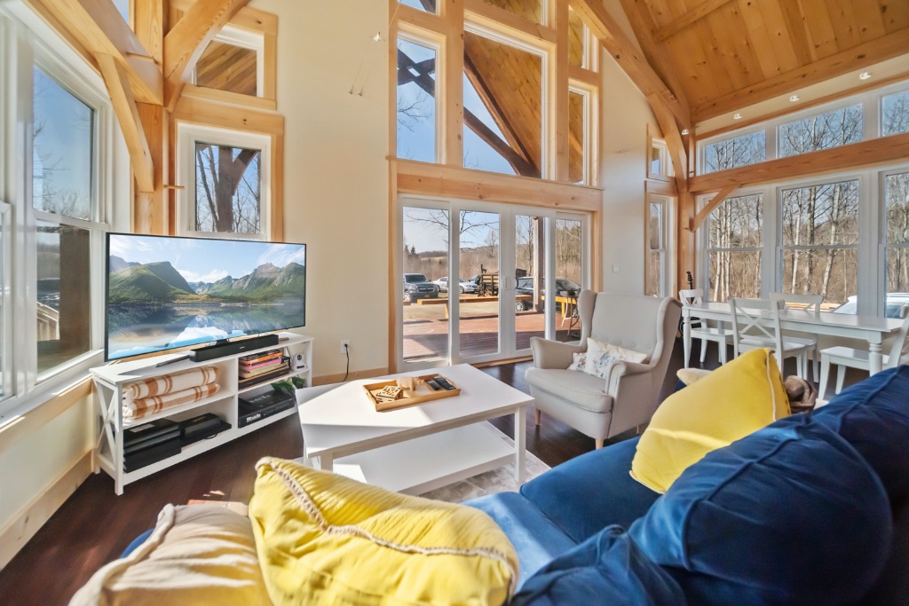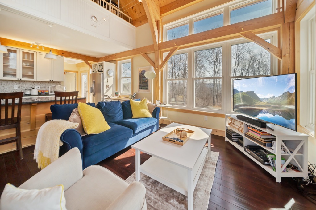 This charming 2400sq ft Southern Yellow Pine cottage is nestled in the forest near Freeville, NY. It boasts a large open living room and kitchen with sliding doors that lead to the front porch. The main floor also has 2 bedrooms, 1 bathroom, and a laundry room. The upper floor features the master bedroom and bathroom, with a slanted roof and exposed timbers that create a cozy atmosphere. It was designed by the Woodhouse design team lead by Raymond Lefebvre when he was the Director of Design at Woodhouse.