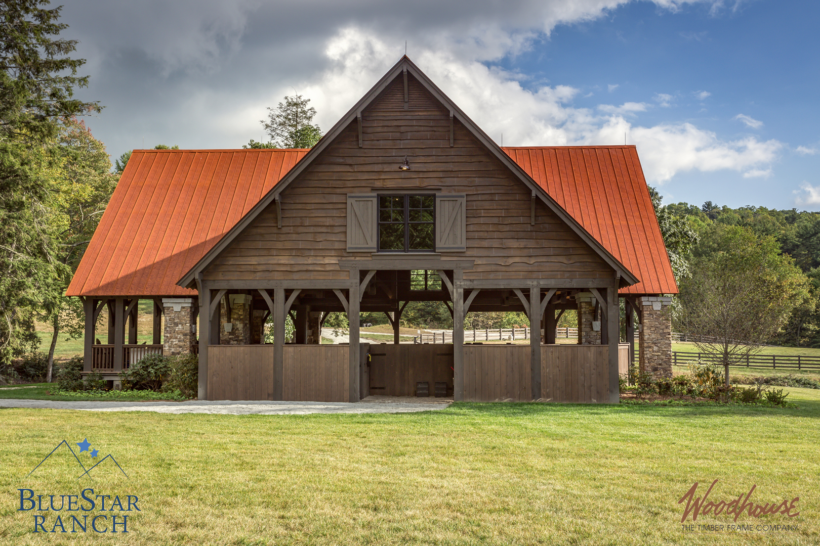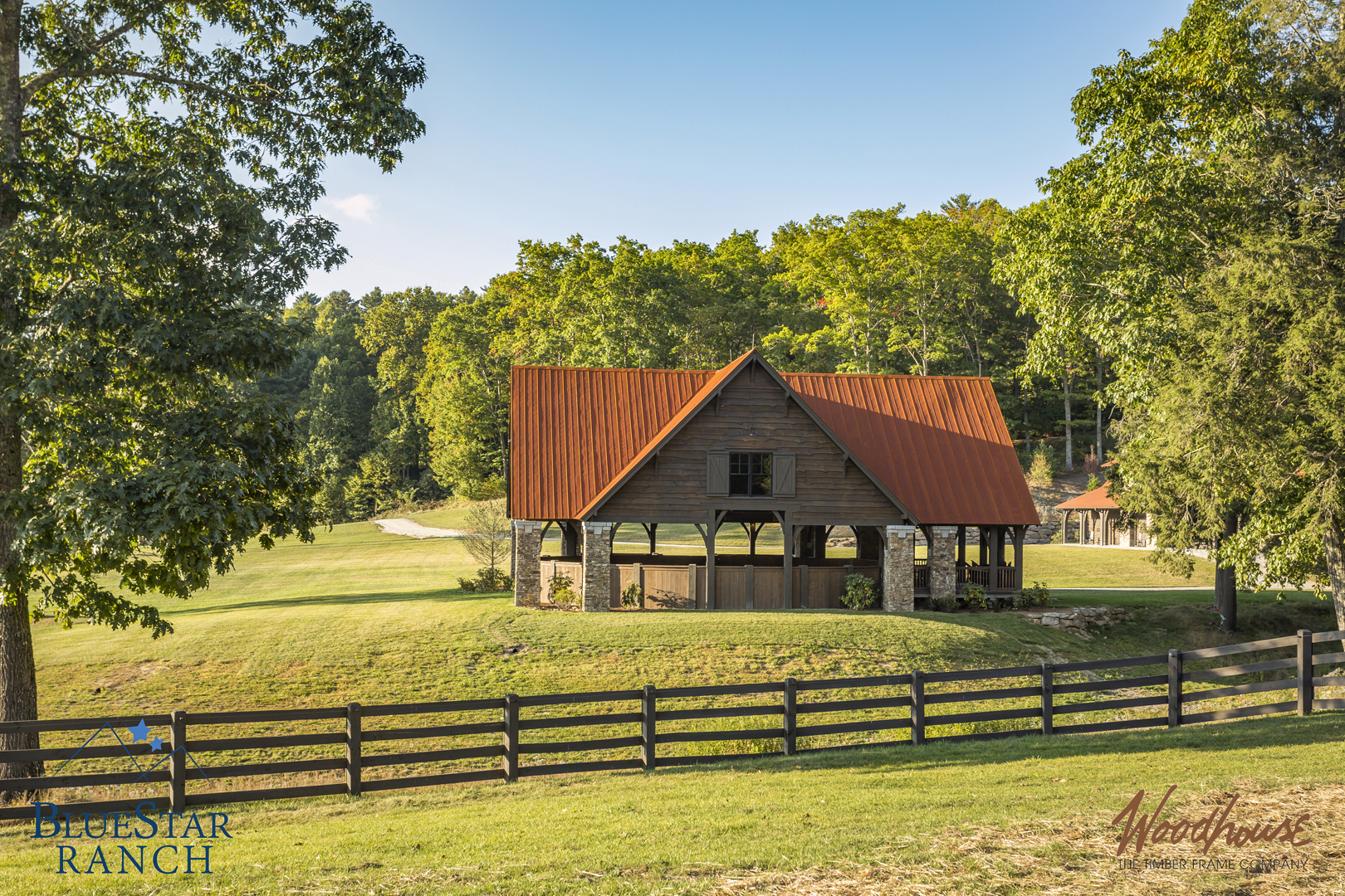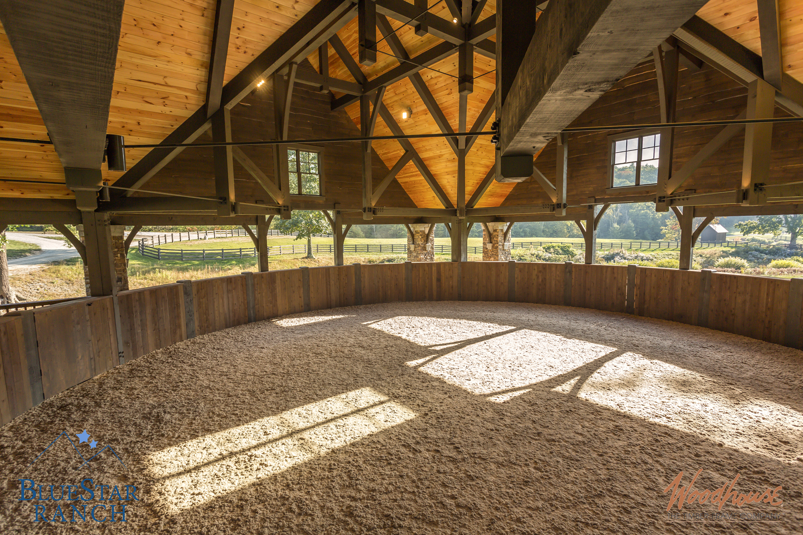 Take a tour of this traditionally styled timber frame round pen for equine activities. Perfect for all sorts of horse training activities, this covered pen enjoys abundant natural lighting and a traditional rustic style accentuated by the stunning timber frame array and supporting stonework. Located in Cashiers, NC, this structure is a part of Blue Star Ranch. More photos from this location can be found here.