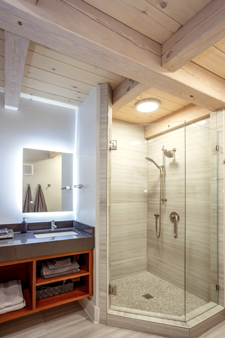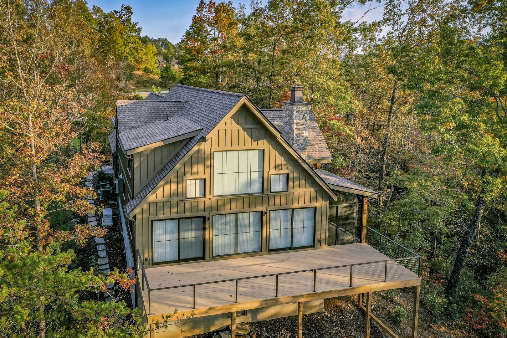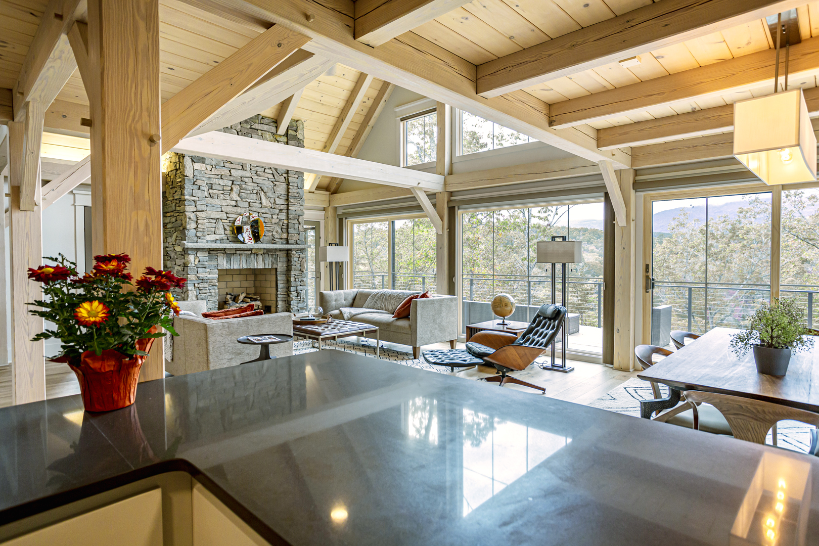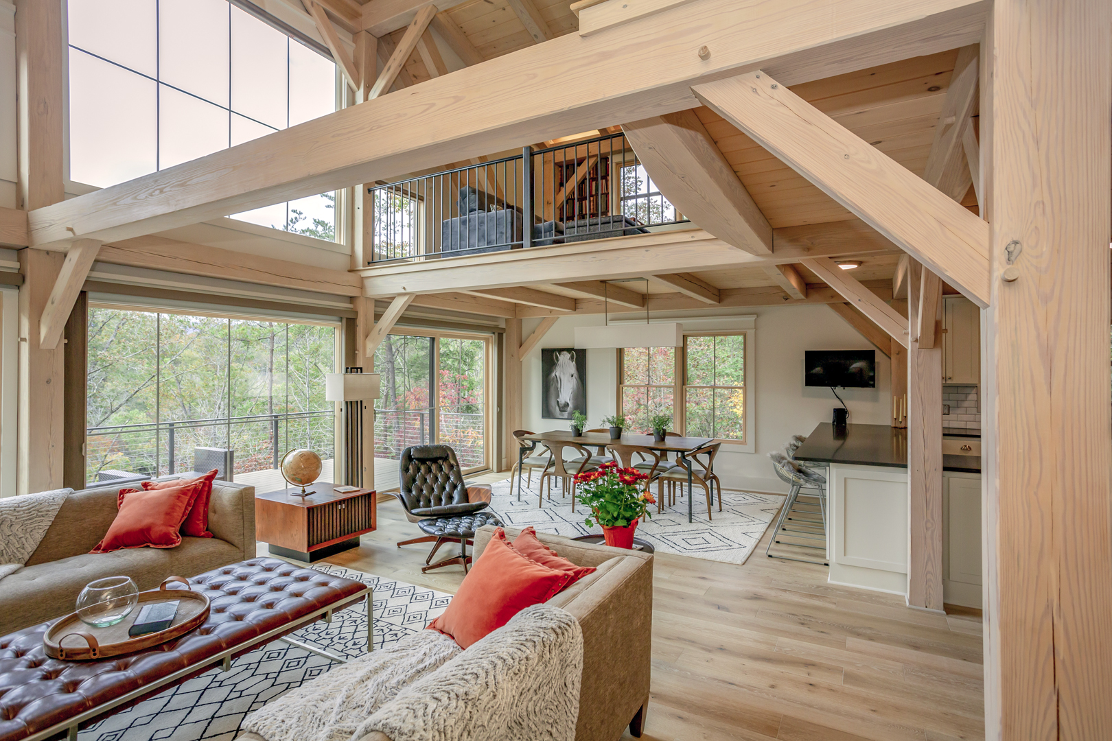 Nestled deep in the forests of North Carolina, enjoying a private view of Lake Adger, sits a cozy refuge, quietly hidden from the world. The owners of this Adirondack Cottage inspired design added a two-car garage and mudroom, plus their own modern minimalist style to the traditional floor plan, creating their perfect dream space that lives the way they want to. Expansive windows and patio doors, and a pickled timber frame and ceiling, ensure that the interior is bright and airy. Take a break from the world and tour this isolated forest dwelling in our latest gallery addition.