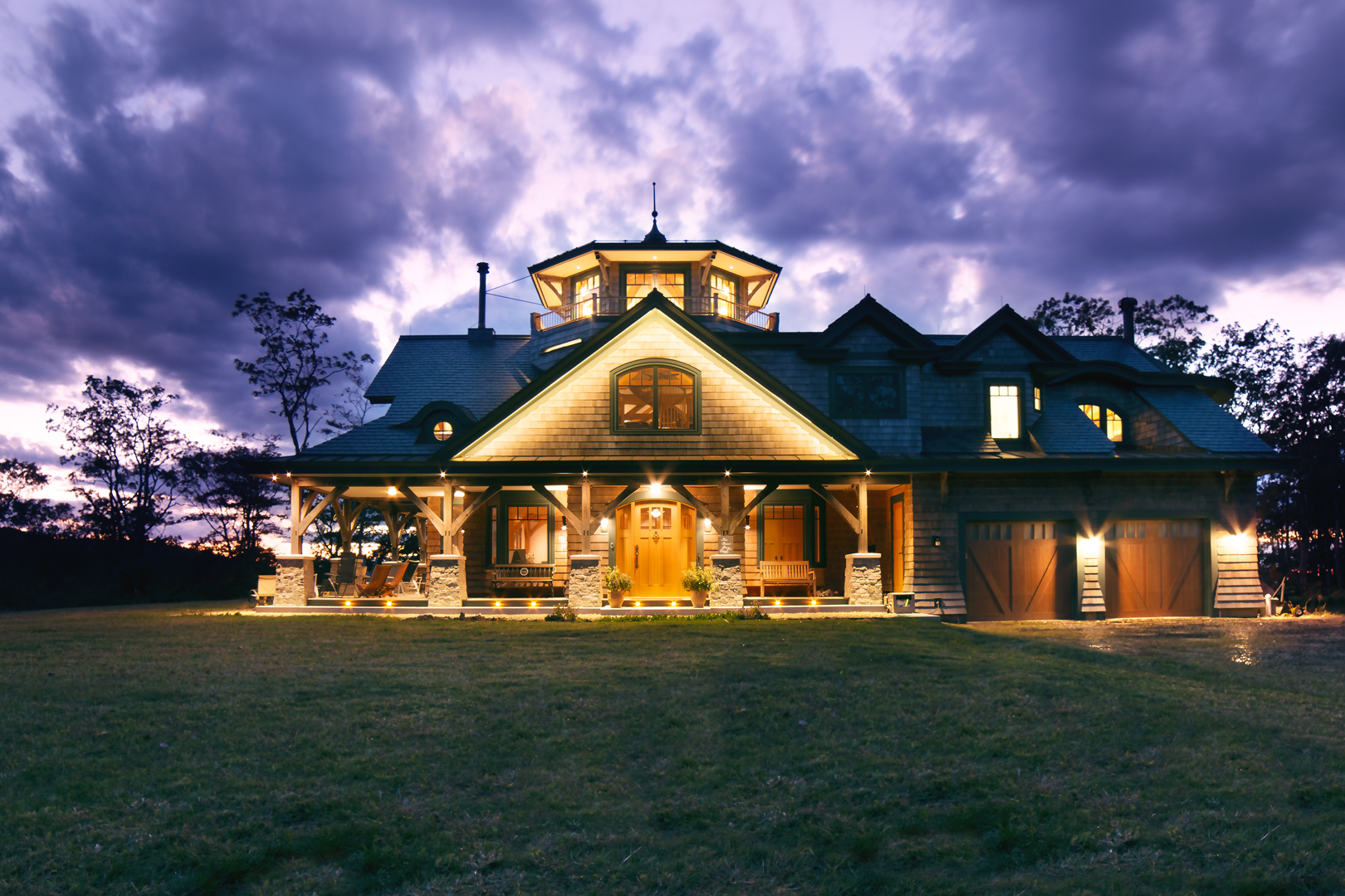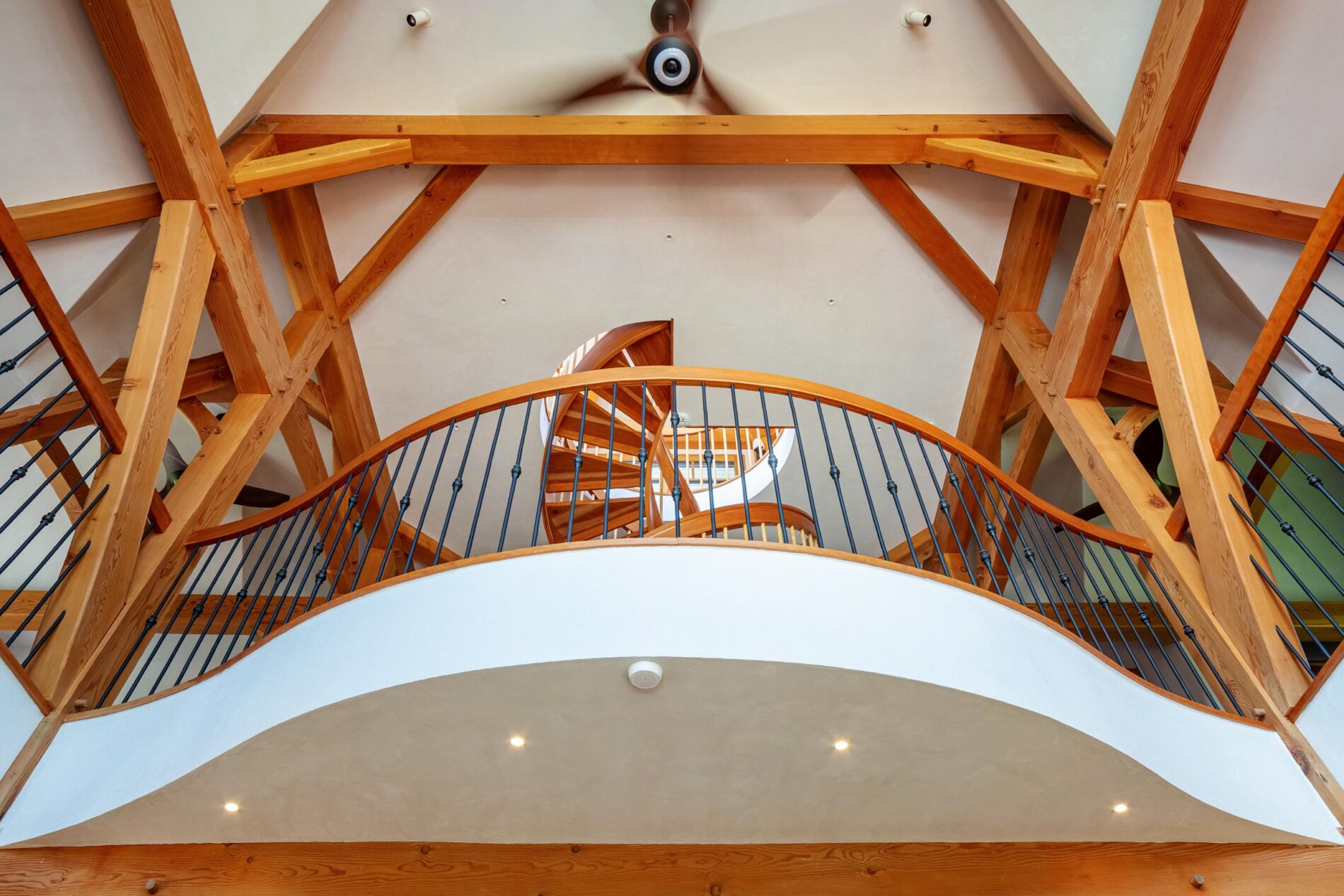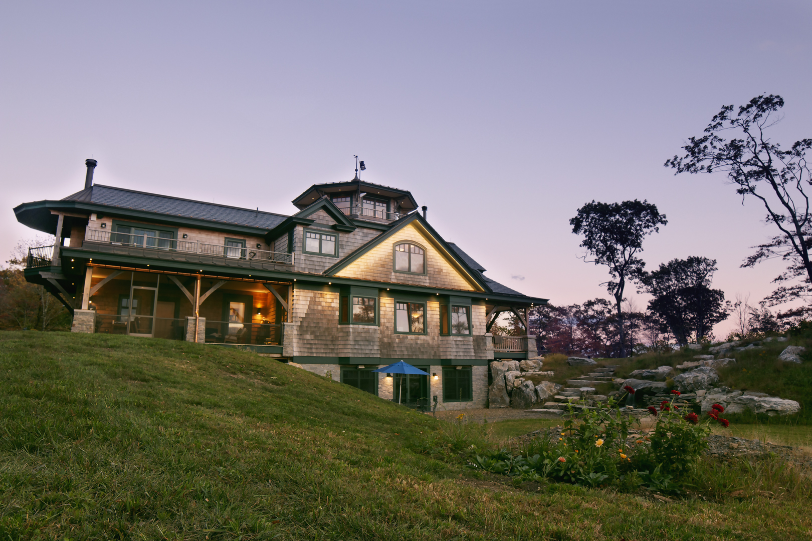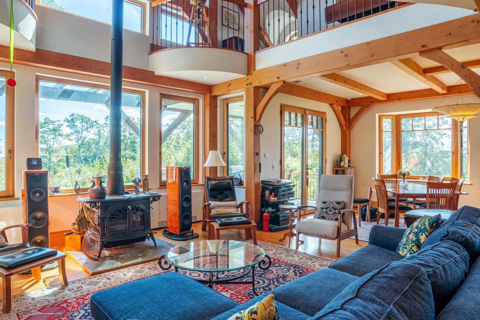 Designed around the central feature of a 360° cupola, this home enjoys an enchanting atmosphere, created through its masterful use of timber framing to shape a variety of nooks and cozy spaces. Stepping out onto one of the many balconies, one can enjoy breathtaking views of the surrounding forest and mountains. Cedar shingles, slate roof tiles, and a copper lining complement the warm color of the timbers perfectly and evoke images of Tolkienesque hobbit homes.