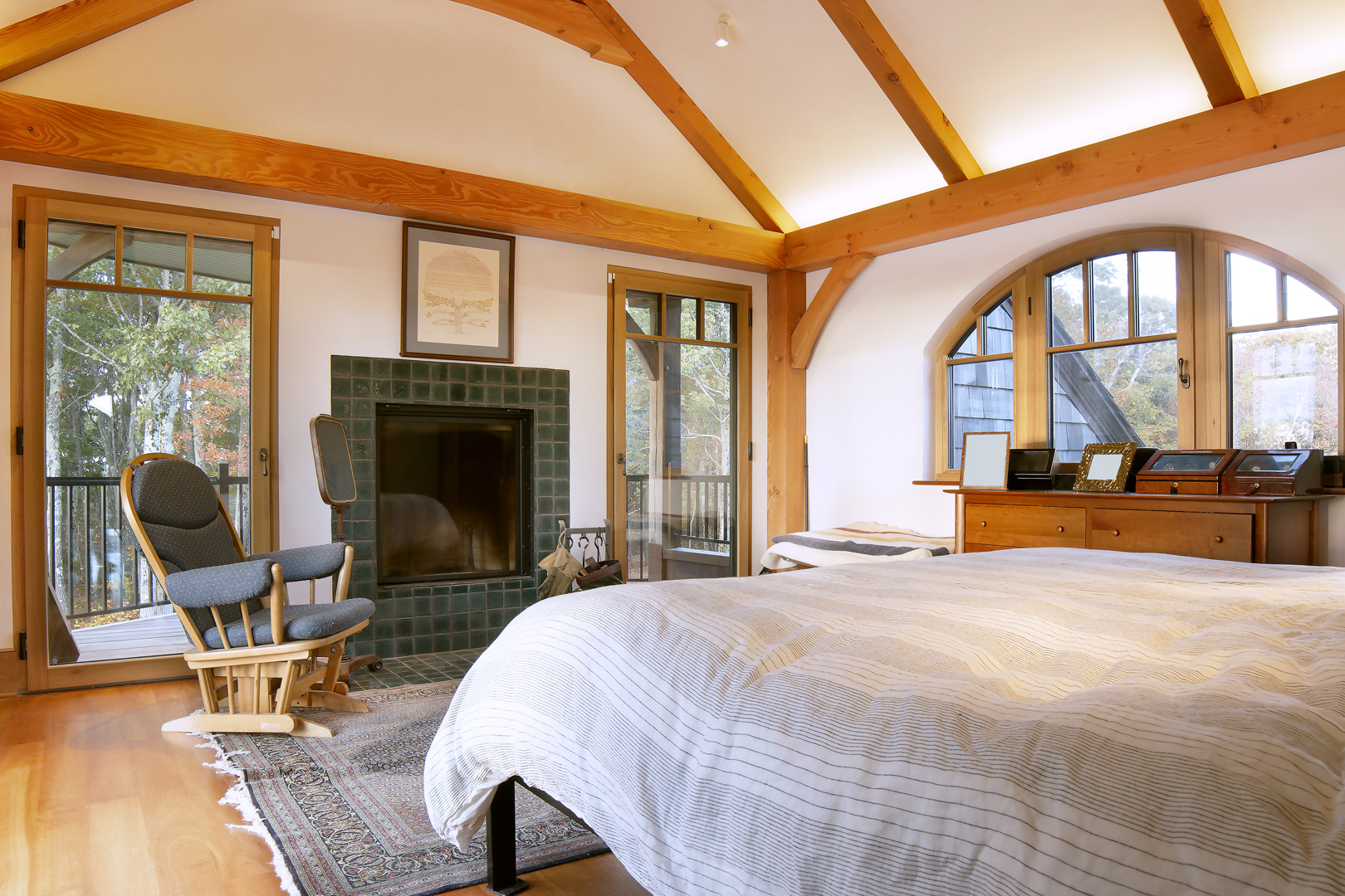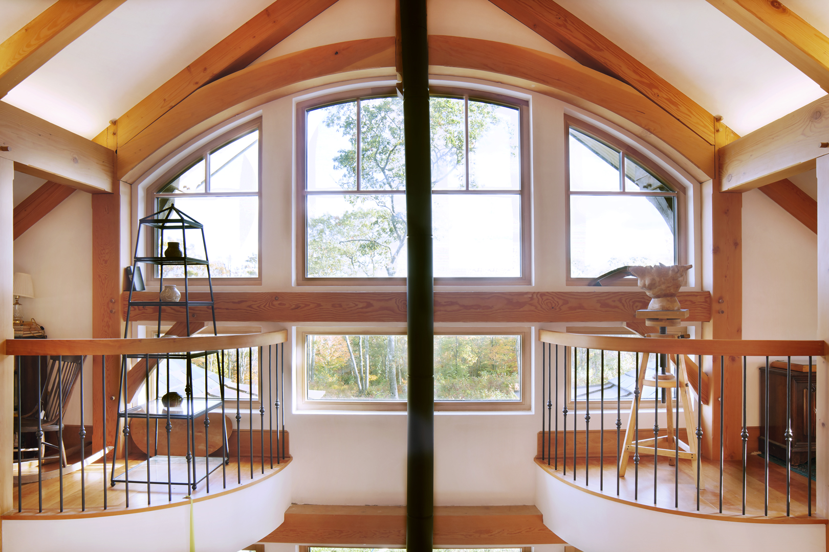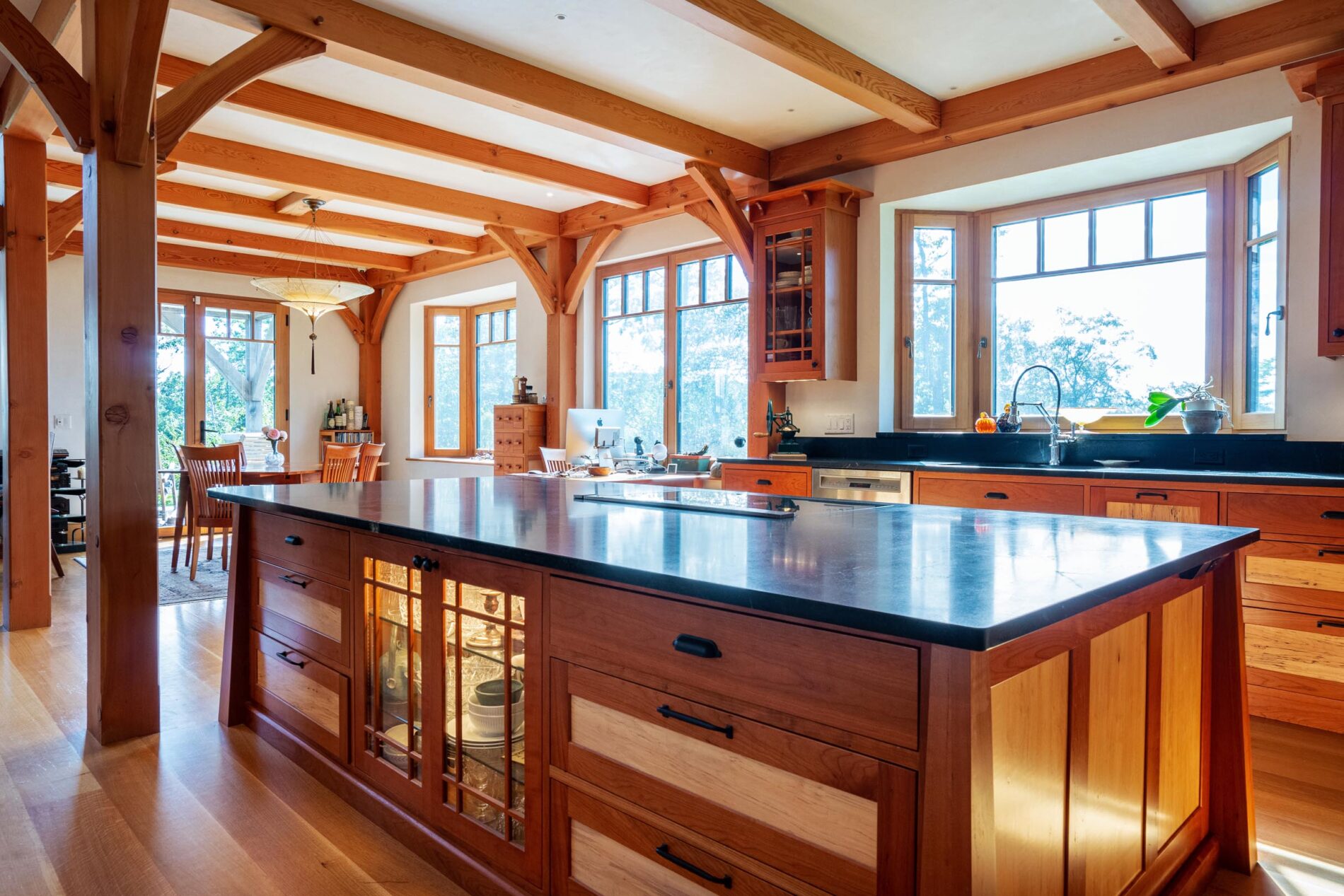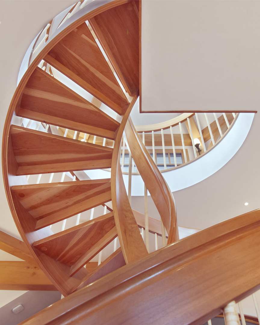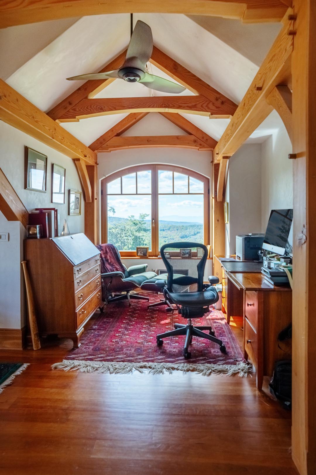 Designed around the central feature of a 360° cupola, this home enjoys an enchanting atmosphere, created through its masterful use of timber framing to shape a variety of nooks and cozy spaces. Stepping out onto one of the many balconies, one can enjoy breathtaking views of the surrounding forest and mountains. Cedar shingles, slate roof tiles, and a copper lining complement the warm color of the timbers perfectly and evoke images of Tolkienesque hobbit homes.