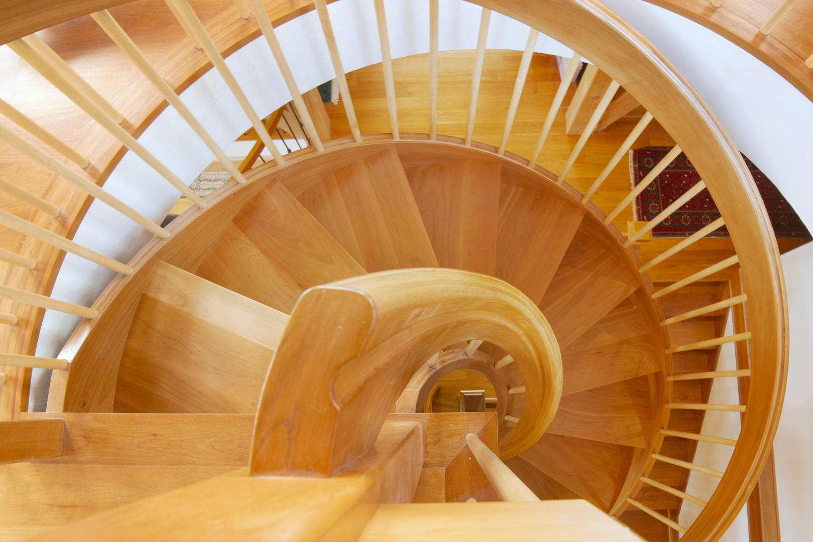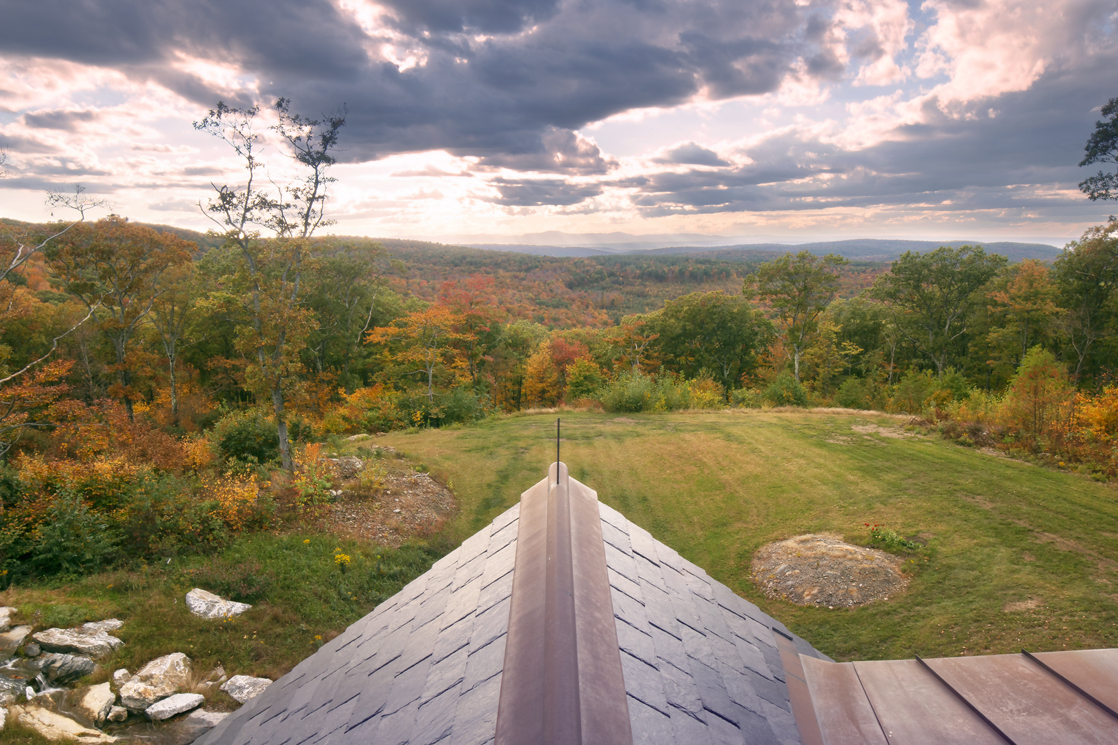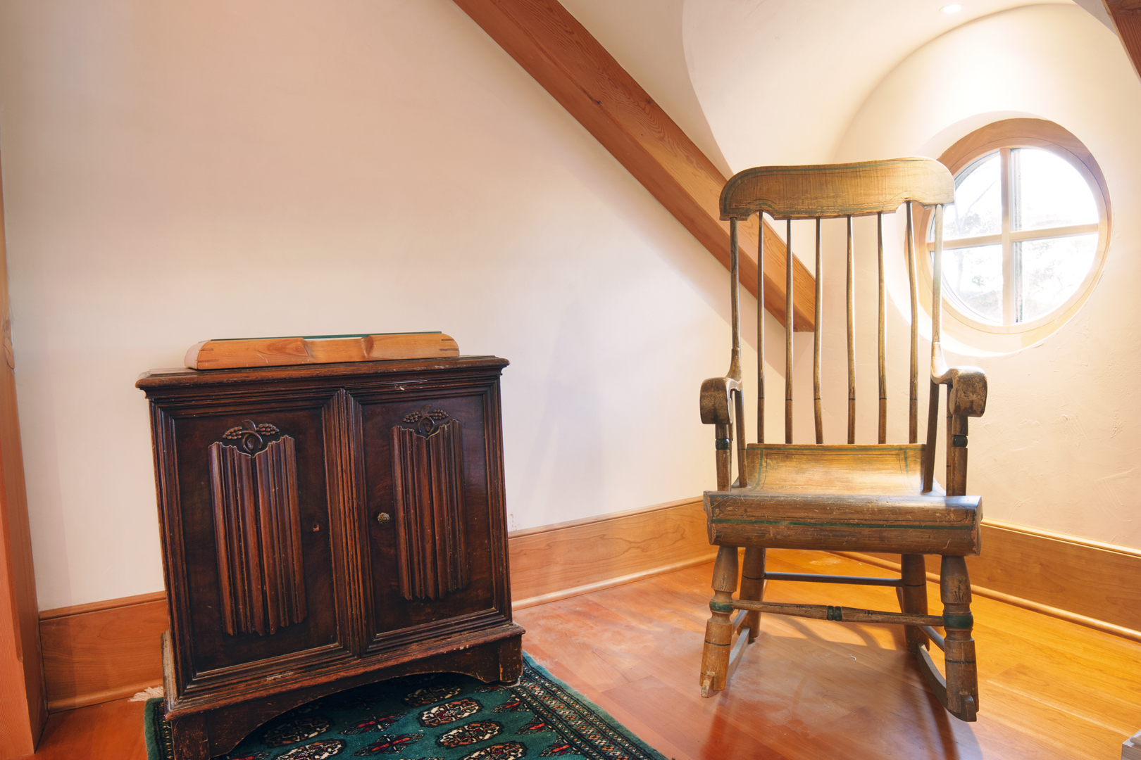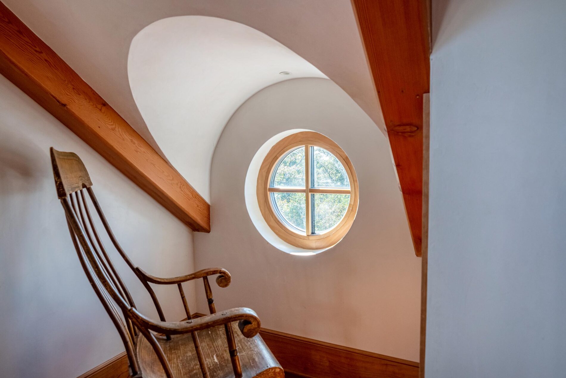 Designed around the central feature of a 360° cupola, this home enjoys an enchanting atmosphere, created through its masterful use of timber framing to shape a variety of nooks and cozy spaces. Stepping out onto one of the many balconies, one can enjoy breathtaking views of the surrounding forest and mountains. Cedar shingles, slate roof tiles, and a copper lining complement the warm color of the timbers perfectly and evoke images of Tolkienesque hobbit homes.