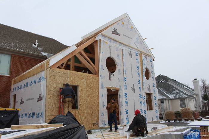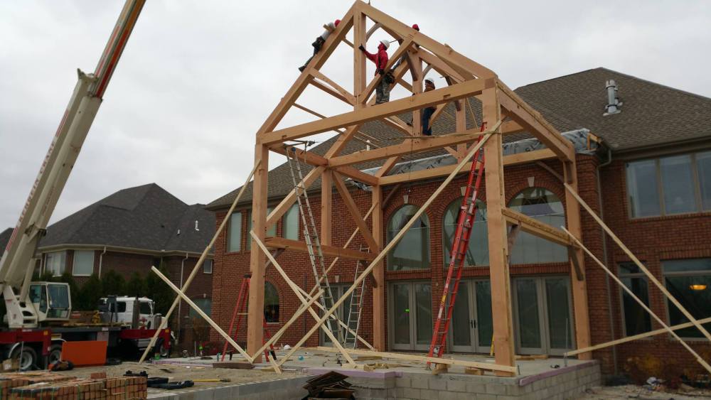 More progress on the timber frame addition going up in Monroe, MI. This addition will be an entertaining space adjacent to the existing living room, with a small kitchenette in the corner.