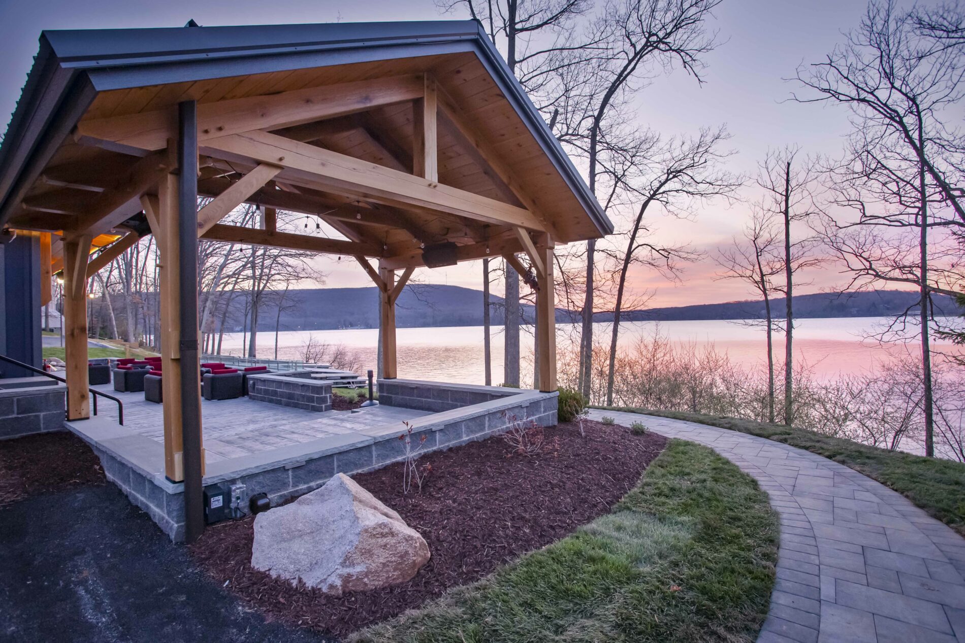 The restaurant owner wanted a timber frame structure that was open, rustic, and elegant, a place that, with its waterfront location, would set the restaurant and bar apart from the competition.