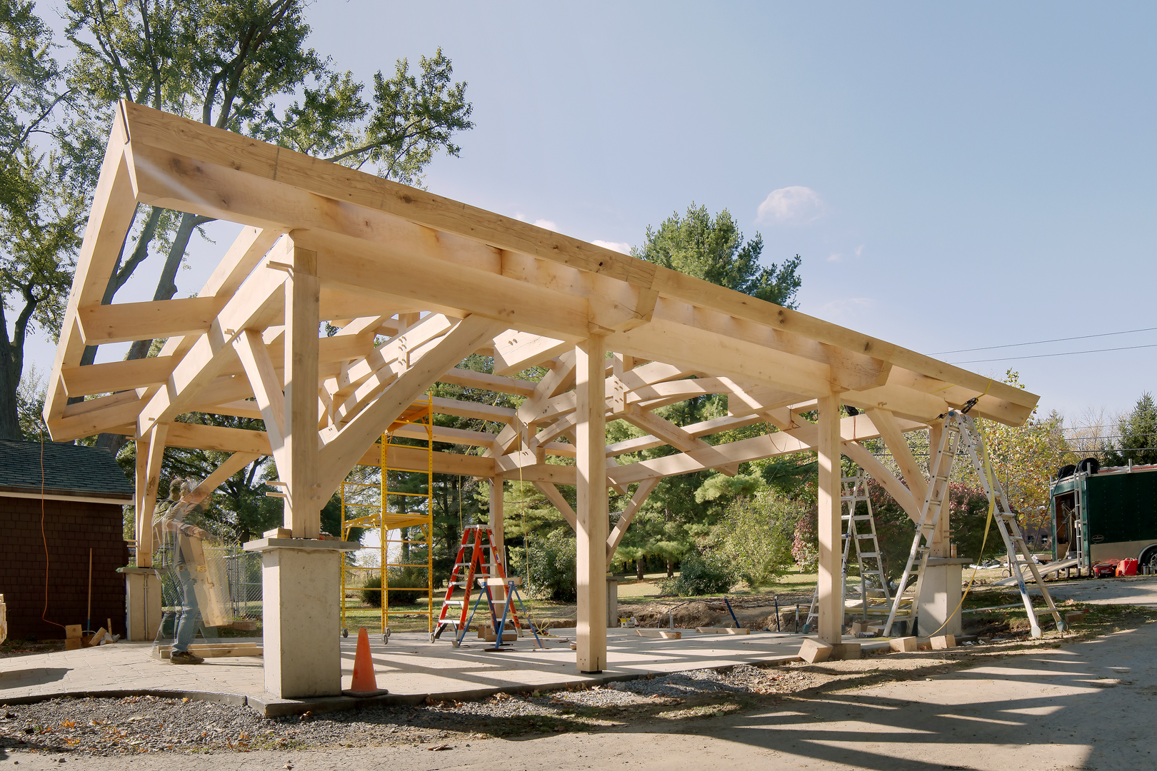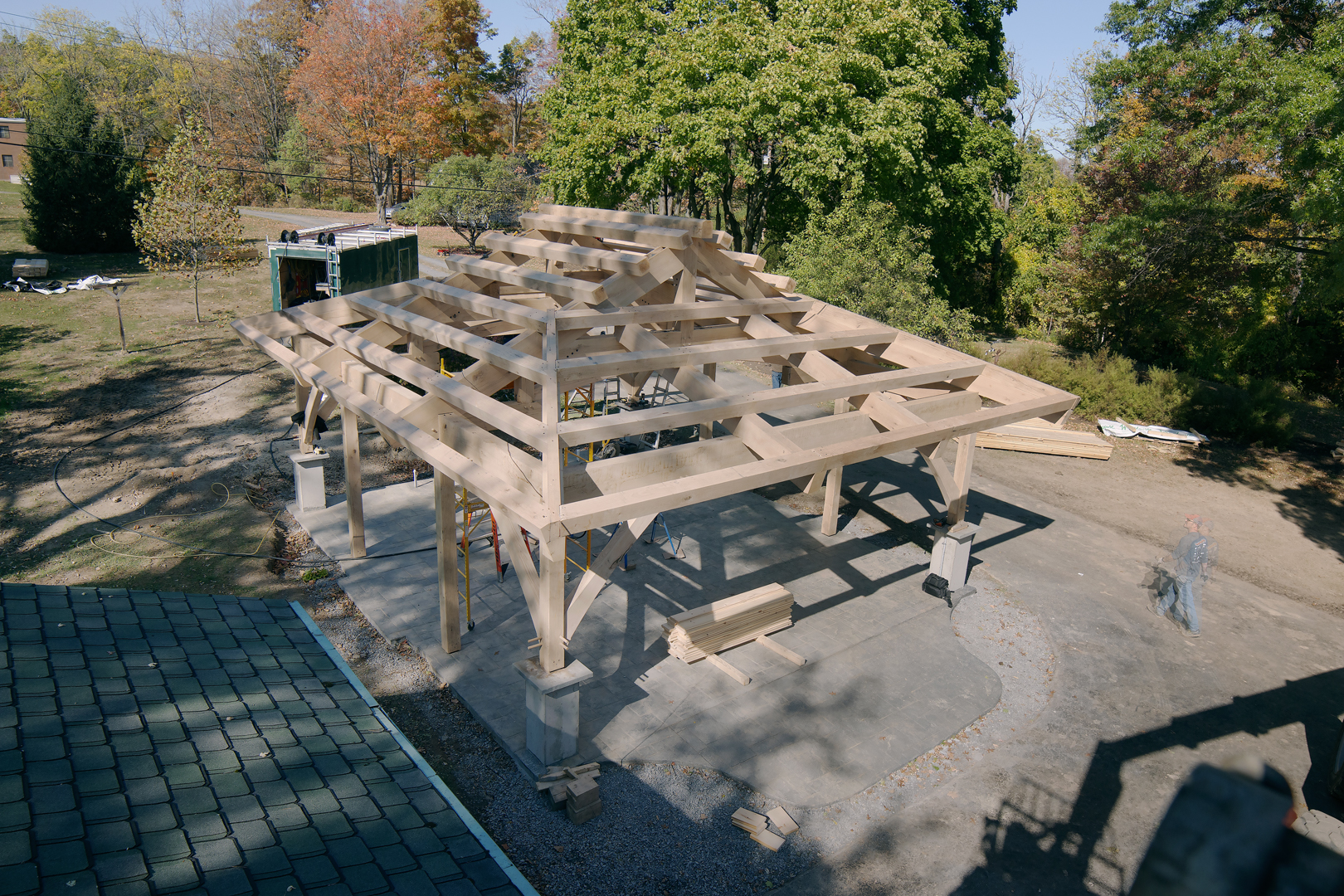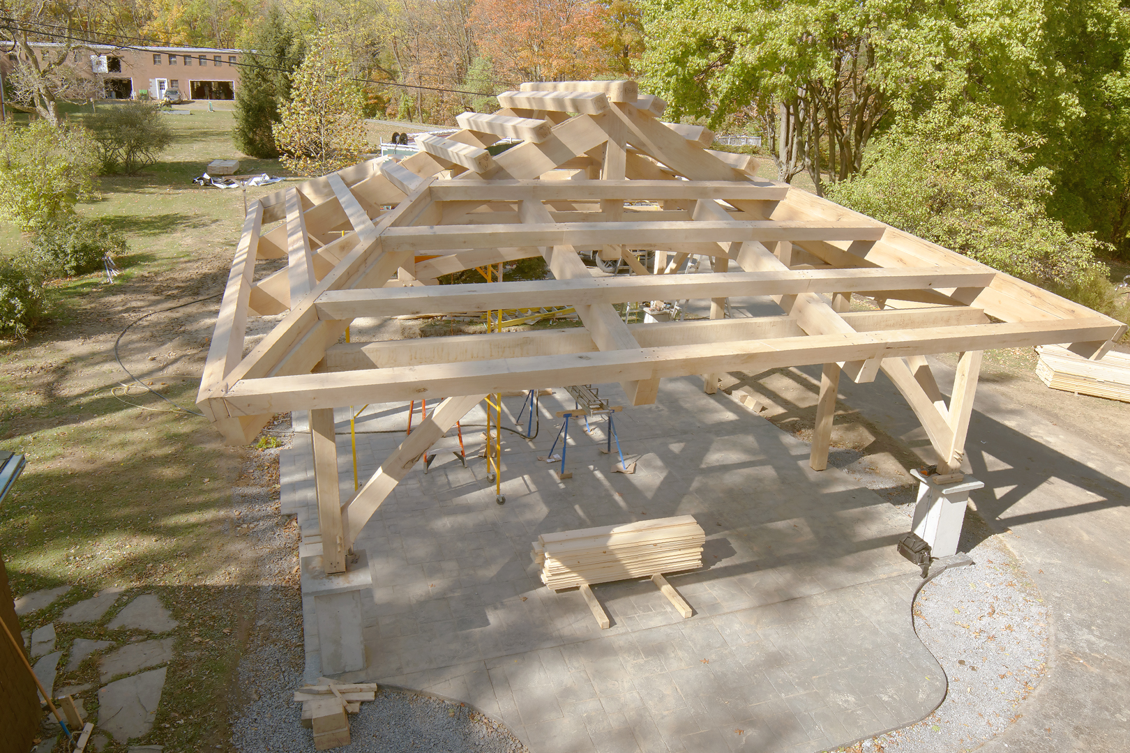 Take a peek at the Woodhouse timber frame building process in this latest gallery: you can see that a concrete pad has been poured to support the pavilion, and the timber frame has just finished being assembled. For a few minutes before the two-inch tongue and groove decking is installed, one gets the chance to observe the fully exposed timber frame in all its glory.